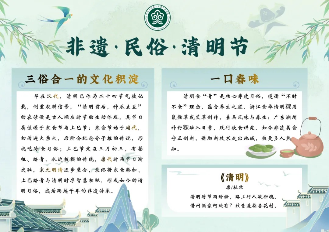 春和景明,清明至矣。这一天,我们追思先人、缅怀先烈,也拥抱春日、感悟生机。愿更多人读懂清明背后的节气智慧与非遗内涵,主动走进传统、了解传统,自觉成为中华优秀传统文化的传承者与传播者,让这份跨越千年的文脉,在新时代得以延续、焕发新的光芒。